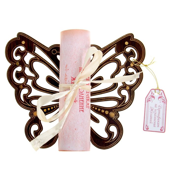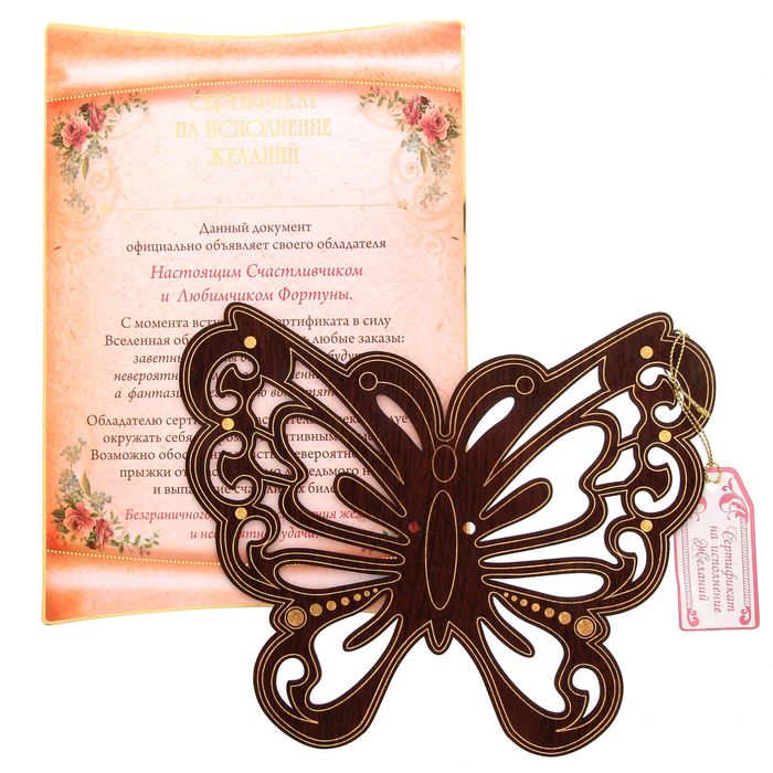 Изделие выполнено в виде лёгкой бабочки, которая несёт на крыльях «пергаментный» свиток с тёплыми пожеланиями и нежными признаниями. Изделие выполнено из дерева с причудливыми завитками и тонкой золотой окантовкой. Чтобы сделать подарок ещё более индивидуальным и памятным, мы оставили место для вашей подписи.