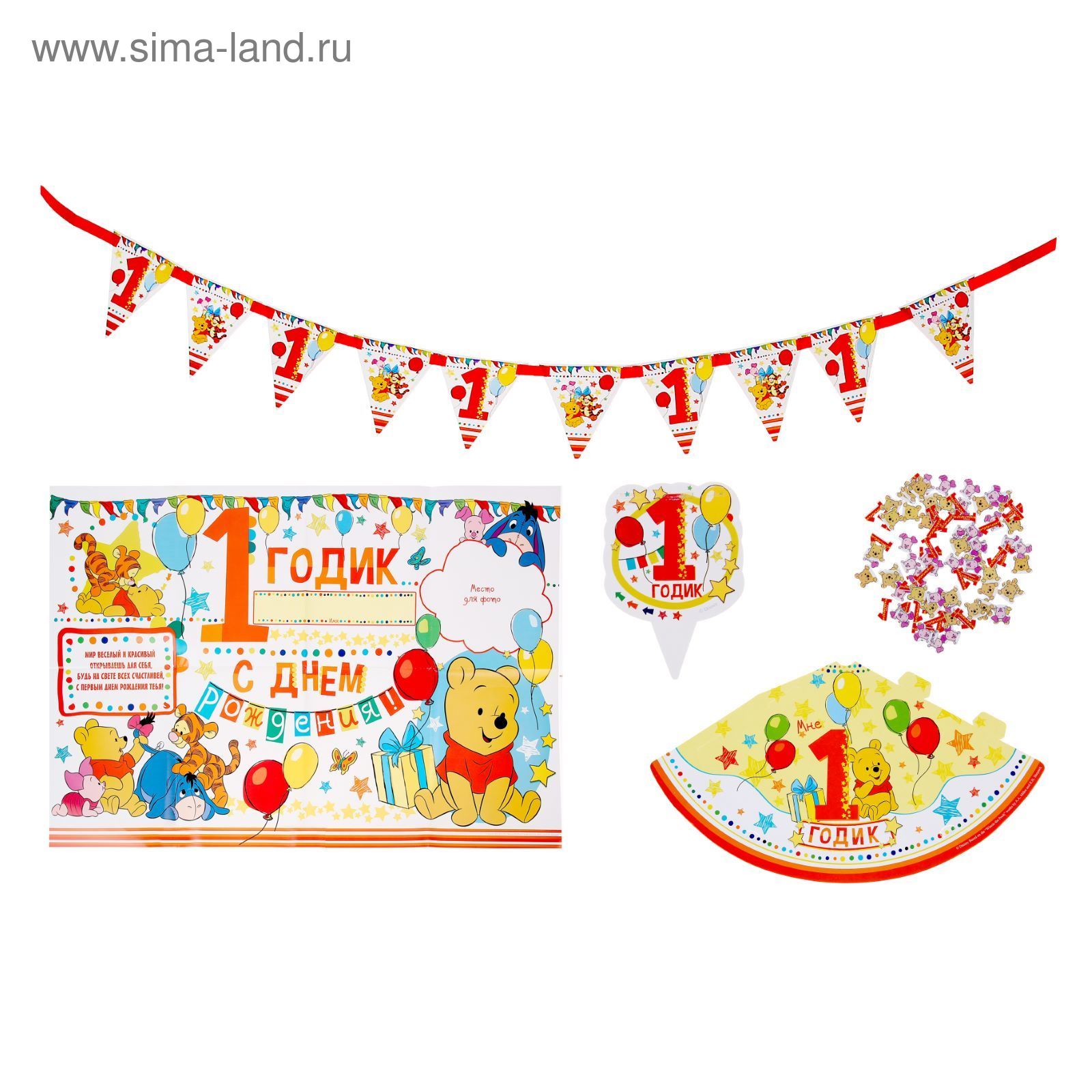 Украсьте комнату нарядной гирляндой. На стену повесьте красочный плакат, на котором вы и гости напишите тёплые пожелания малышу. Нарядите чадо в милый праздничный колпачок. Разложите на стол яркий набор конфетти и не забудьте про украшение для тортика.