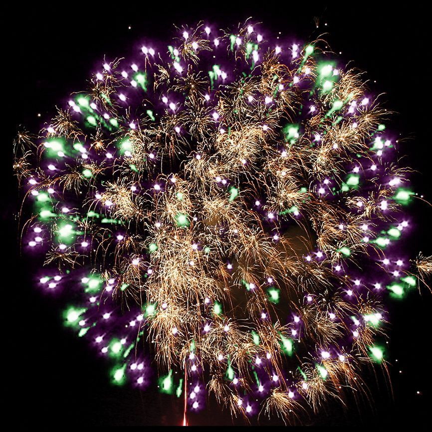 3. Фиолетовых и зелёных огней, множеством золотых трещащих сфер;