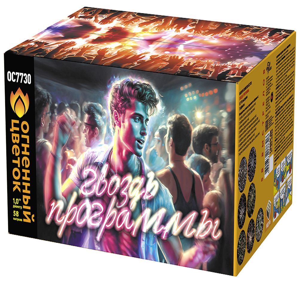 Этот фейерверк станет гвоздем программы любого мероприятия!Батарея салютов "Гвоздь программы" от "Русской пиротехники" - настоящий художественный шедевр, который притягивает взгляды и заставляет сердца замирать от восторга. Каждый выстрел, как кисть художника, создающая яркие и неповторимые картины на ночном небе.Цвета, формы и узоры, которые рисует этот салюта, словно оживают и танцуют в воздухе. Они переплетаются и сливаются, создавая невероятно красивые композиции, не оставляющие равнодушными ни одного зрителя!Эффекты (изображены на картинке):Разноцветные кометы разрываются сферами из:1. голубых, красных и золотых мерцающих огней;2-3. серебряных искристых форсов, красных мерцающих, фиолетовых и зелёных мерцающих огней;4. серебряных форсов и красных мерцающих огней;5. красных и зелёных огней, множеством трещащих сфер;6. серебряных форсов с красными огнями на концах и множества трещащих огней;7. коротких трещащих форсов и синих, красных, зелёных огней.