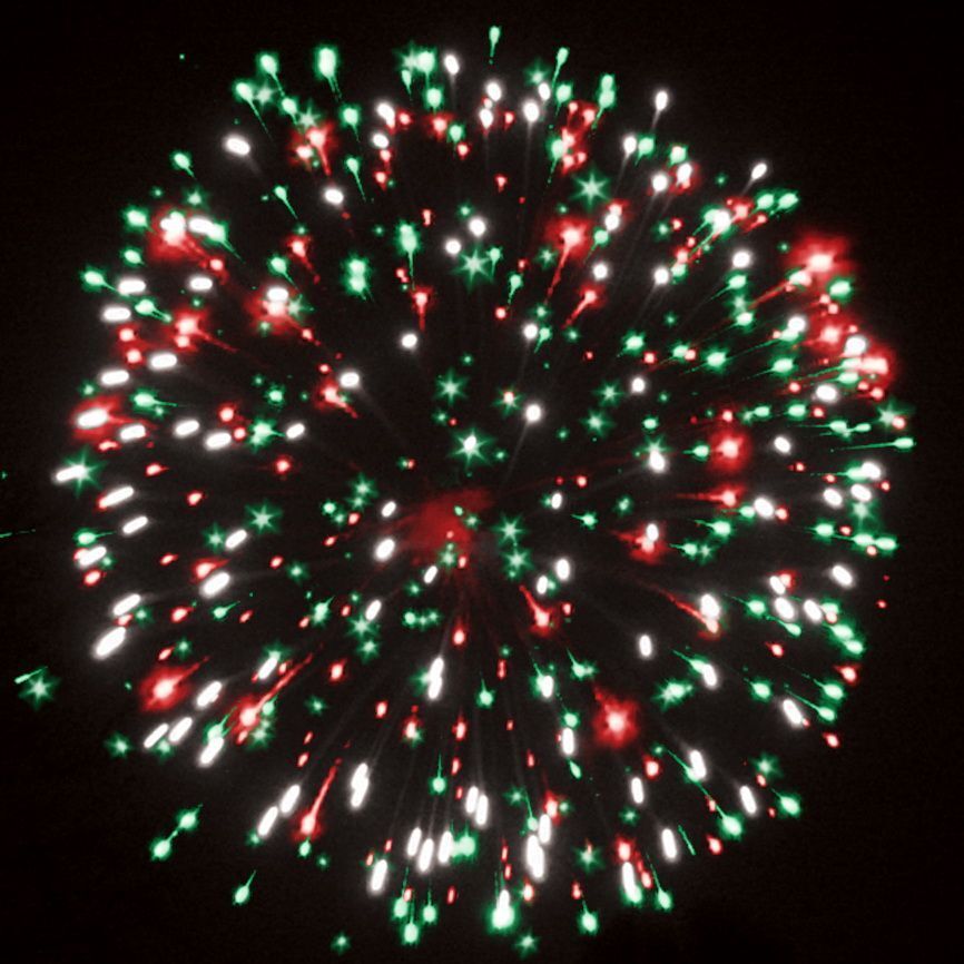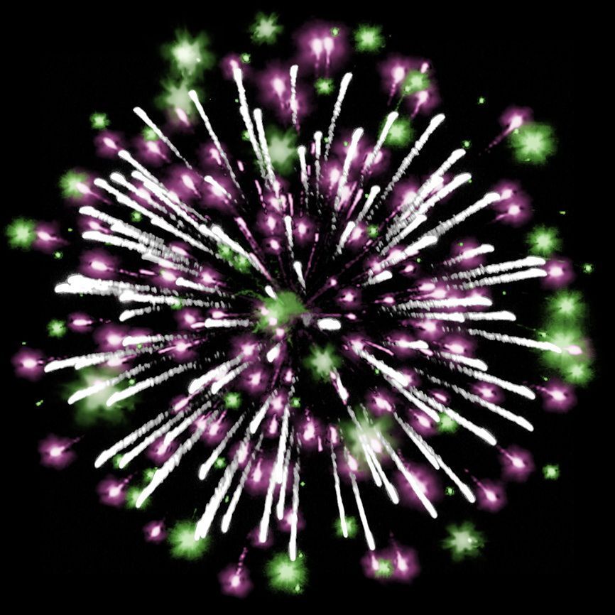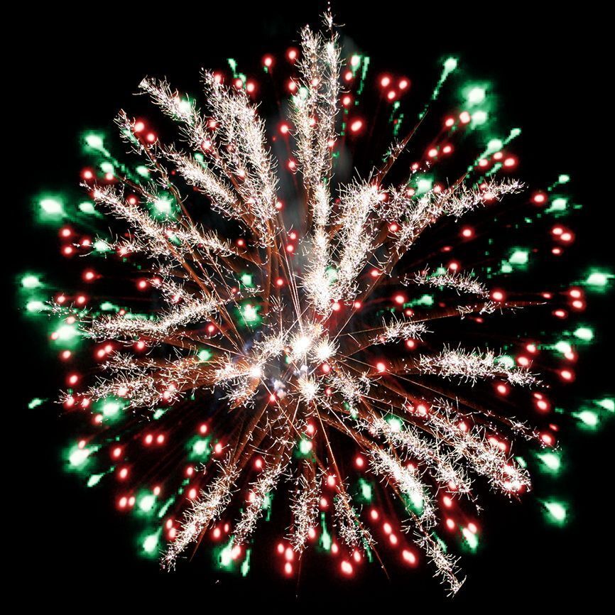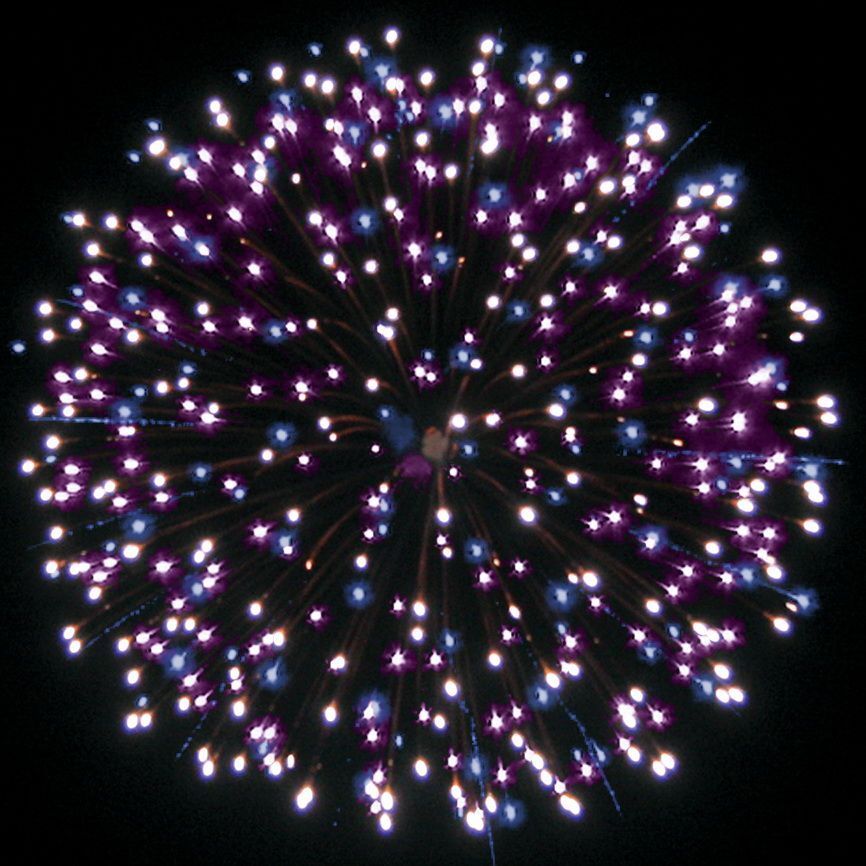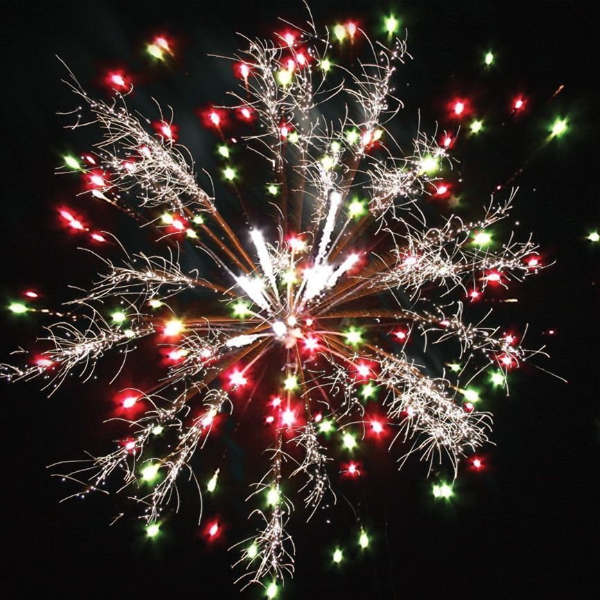 Эффекты (изображены на картинке):Разноцветные кометы разрываются сферами из:1. серебряных форсов с трещащими искрами, красных и зелёных мерцающих огней;2-3. красных, зелёных и белых мерцающих огней, серебряных трещащих искр;4. фиолетовых, синих и белых мерцающих огней;5-6. серебряных форсов, фиолетовых и зелёных огней, красных и белых мерцающих огней;7. золотых форсов, красных и синих огней.8. свистящие элементы.