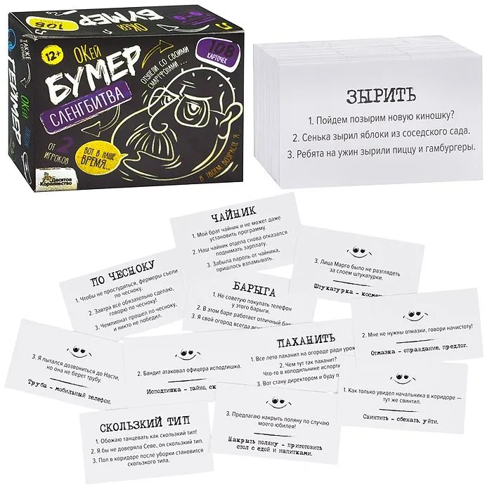 С настольной игрой для большой компании «Сленгбитва. Окей Бумер» игроки проверят уровень знаний сленга старшего поколения. Они должны правильно ответить на вопросы: что такое "нести пургу" и "стрематься"? кто такой "корефан" и "баклан"? и другие. Победит тот, кто даст больше правильных ответов!