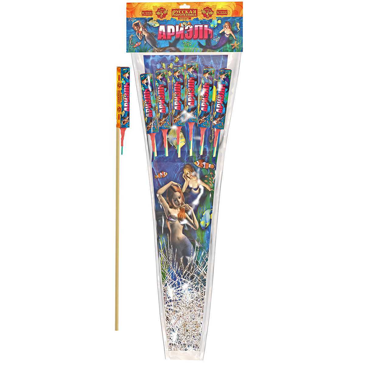 Пополнение в ряду всеми любимых мини-ракет - "Ариэль". Это 6 миниатюрных ракет, каждая их которых содержит какой-то свой, особенный эффект. Упаковка ракет больше походит на классические большие ракеты. Перечень эффектов ракет "Ариэль": золотые падающие огоньки