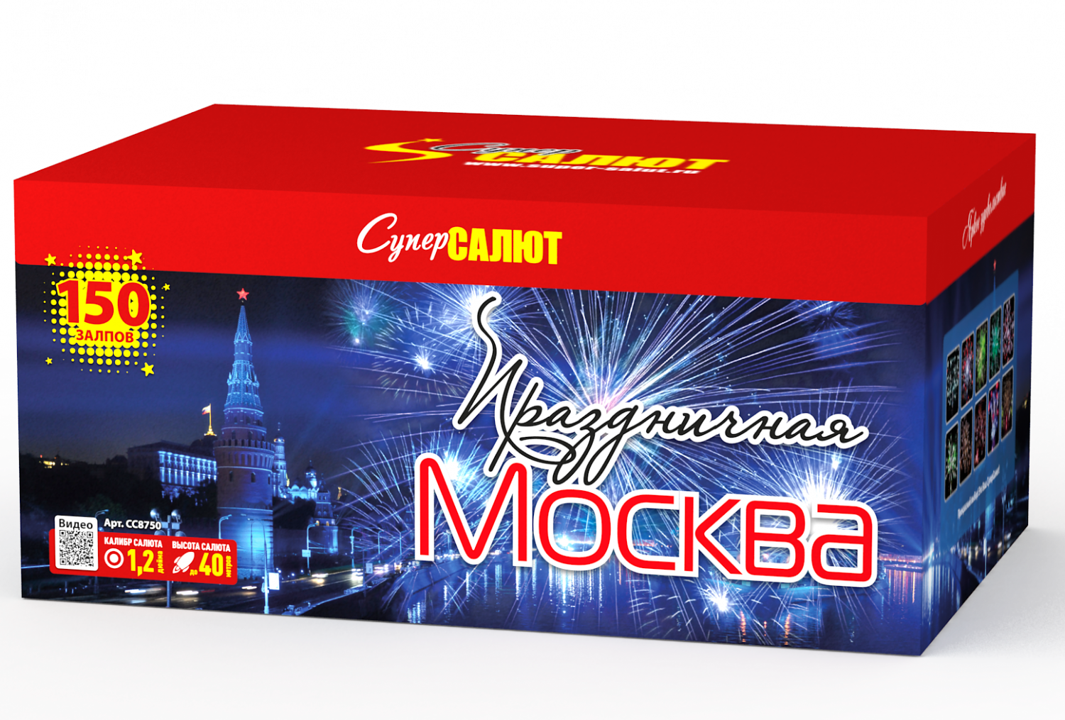 Москва любит погулять на широкую ногу! Во все времена Праздничная Москва вызывала восхищение у всех, кому посчастливилось оказаться на ее улицах и площадях во время "красных дней календаря"... Шумная, веселая, великолепно украшенная - кажется, ощущение радости и праздника витает в самом воздухе... И разумеется, ни один праздник в этом городе не обходится без пышного, оглушительного и яркого фейерверка! Салют "Праздничная Москва" передаст частичку этих сказочных ощущений и Вашему празднику - где бы Вы не находились. Эффекты яркой салютной батареи "Праздничная Москва": жемчужные вспышки и мерцающие облака